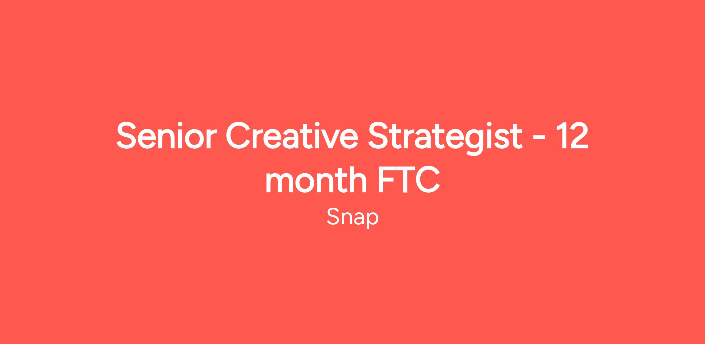 We're looking for a Senior Creative Strategist to join Snap Inc in London! As a Senior Creative Strategist, you'll become a key player in driving the creative ambition of the business across some of our largest advertisers, and you will be a catalyst who inspires marketers, excites agencies and unlocks revenue through strategically led ideas.